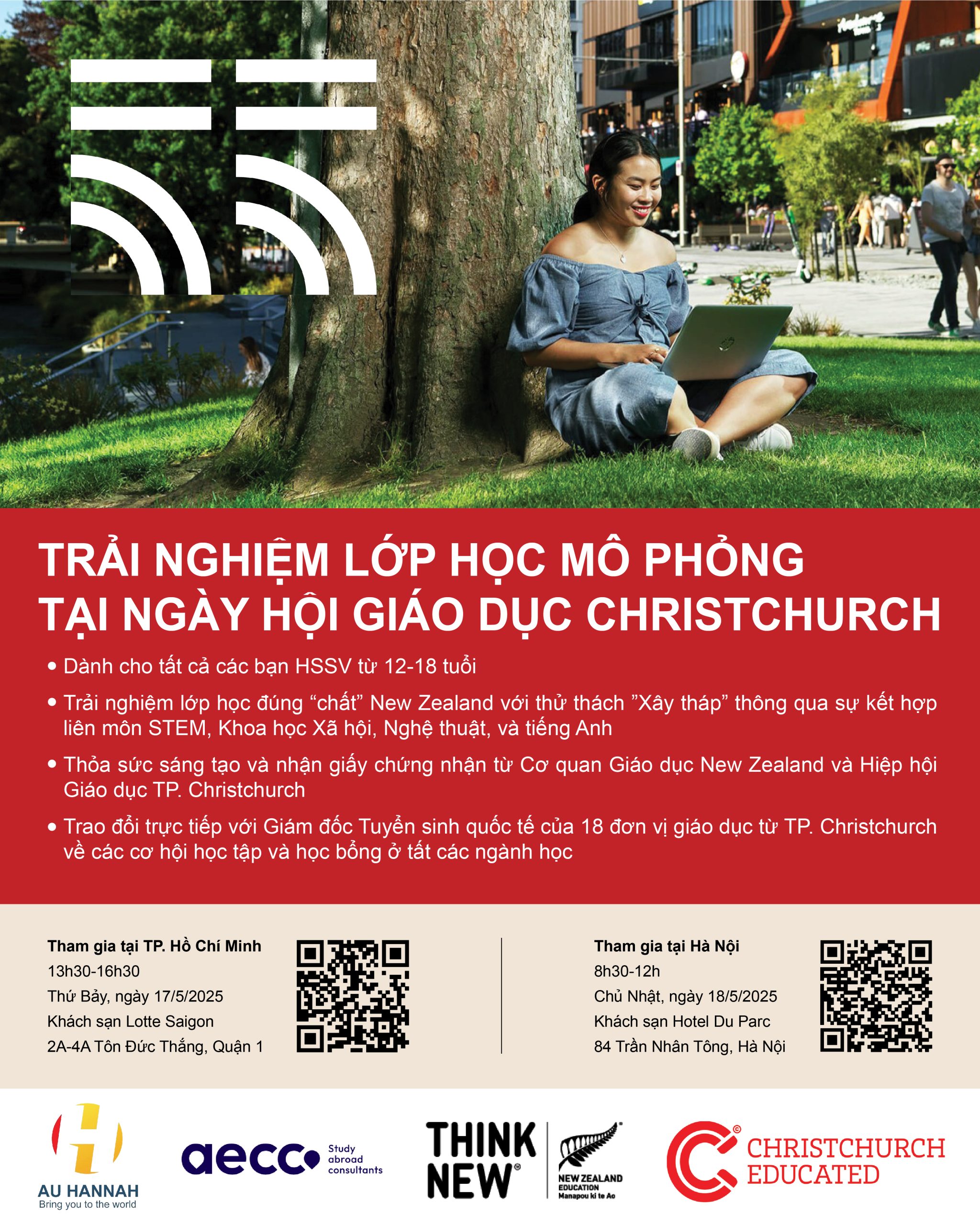Trong năm 2025, Christchurch Educated cùng 18 cơ sở giáo dục từ khu vực này sẽ có mặt tại các sự kiện giáo dục ở TP.Hồ Chí Minh, Hà Nội và Đà Nẵng – mở ra cơ hội tiếp cận trực tiếp với các đại diện trường, tìm hiểu về học bổng và cuộc sống học tập tại New Zealand.